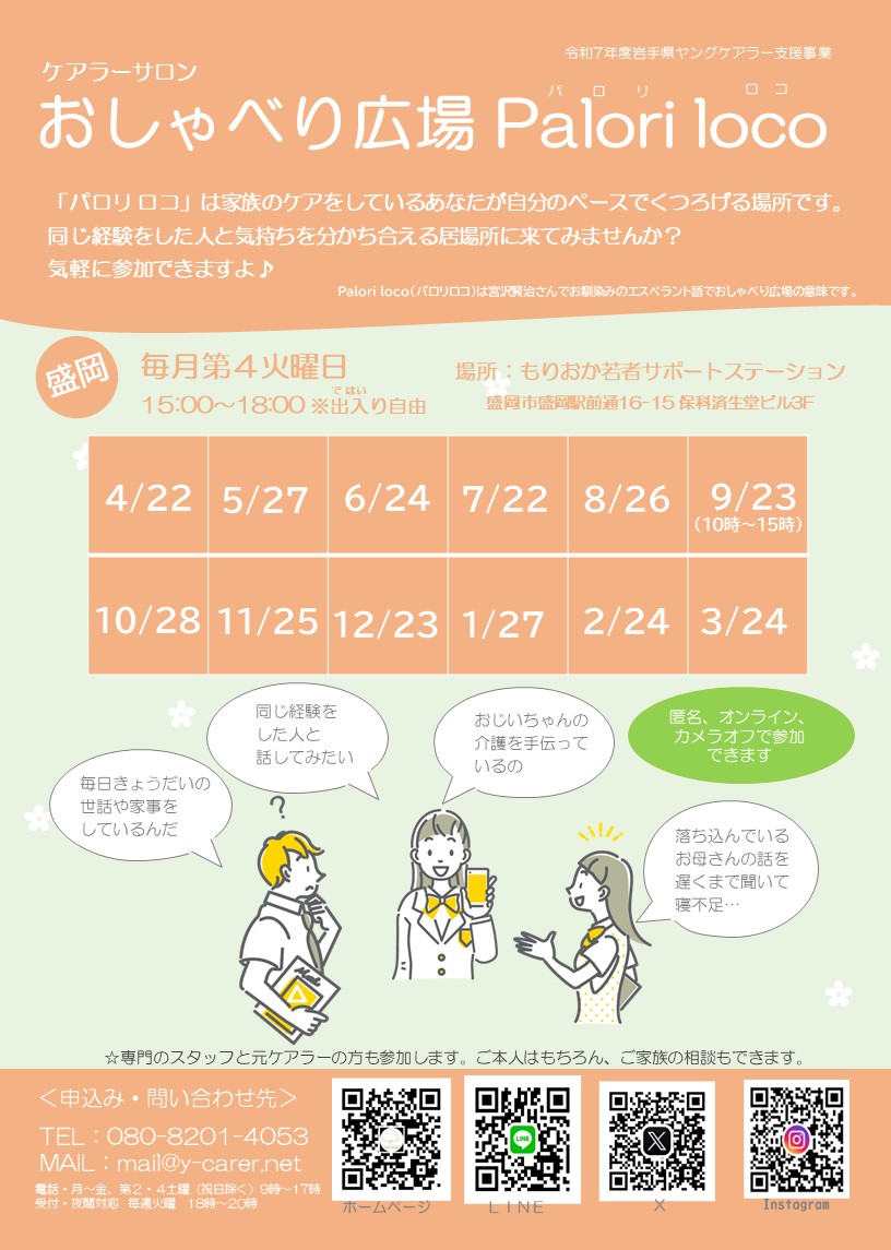 ホームおしゃべり広場 明日(9/23)はおしゃべり広場祝日ver.です 2025年9月22日 SHARE ポスト シェア はてブ LINE こんにちは!秋分の日の明日、10時~15時までおしゃべり広場Palori loco やってますよ♪ 静かに過ごすこともできるので気分転換に来てみてくださいね!(インスタに道案内動画をアップしています♪) 正面奥がメトロポリタンホテル盛岡 手前のangelビルの隣が保科済生堂ビル 保科済生堂ビル入り口 階段を上るとサポートステーション入り口があります 漫画はこの3倍あるよ☆ Follow me!